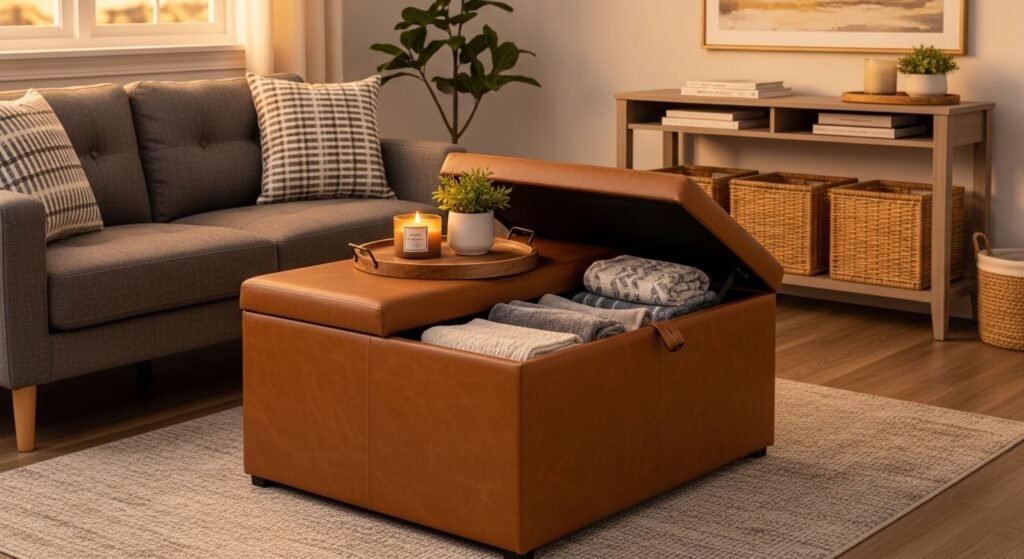 Multi-functional furniture is essential among cozy small living room ideas because it reduces the number of individual pieces you need, leaving more breathing room. A storage ottoman, for example, hides blankets and remotes out of sight while providing extra seating and a surface for snacks. This decluttered approach inherently feels cozier because a tidy, organized space is always more relaxing than a crowded one.