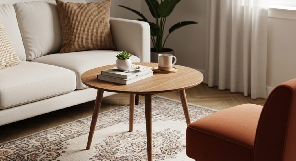 This is one of those practical cozy small living room ideas that improves both form and function. A round walnut or oak table adds warmth through natural wood tones, while a marble-topped option brings elegance. Keep the tabletop relatively clear — just a small stack of books, a candle, and a plant — to maintain that open, relaxed feeling that defines true coziness.