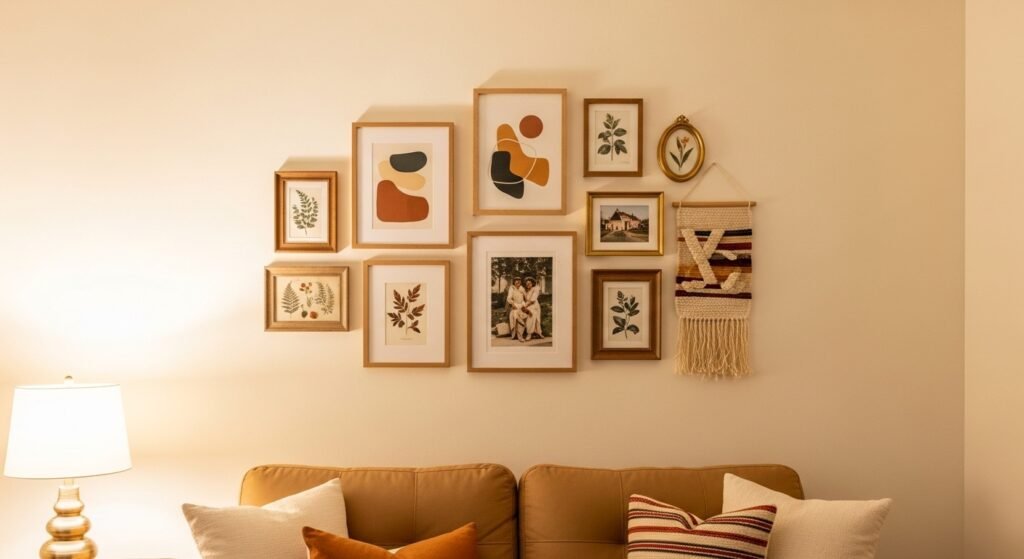 A gallery wall transforms a blank wall into a visual story that reflects your personality and adds incredible warmth to a small space. By filling vertical space with art, photos, and textural pieces, you draw the eye upward and create the illusion of a larger, more curated room without adding any physical bulk.