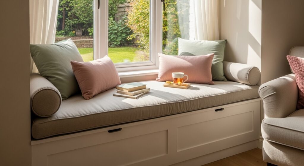 If your small living room has a window, a built-in window seat is one of the most charming cozy small living room ideas you can implement. It creates additional seating, provides hidden storage beneath the hinged top, and establishes a natural gathering spot that takes advantage of beautiful natural light.