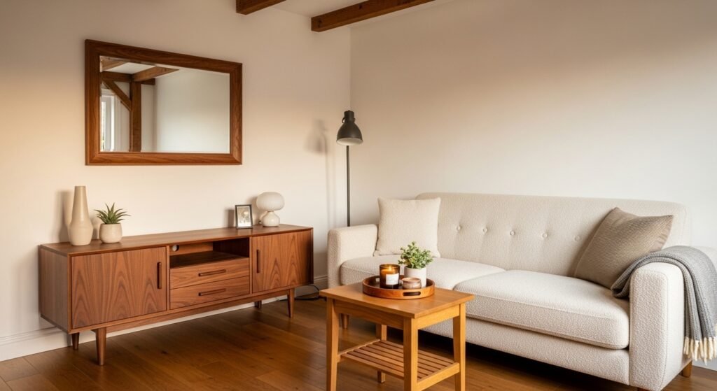 This is one of the most timeless cozy small living room ideas because it works across every design style. Mix different wood species and finishes for a collected-over-time look, but keep them within the same warm tone family — think walnut, oak, and cherry rather than mixing warm and cool-toned woods. Wooden picture frames, bowls, trays, and plant stands are easy ways to add warmth without committing to large furniture pieces.