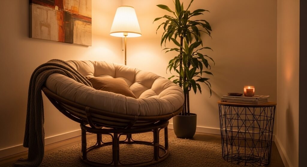 A statement chair like a papasan, egg chair, or plush swivel chair tucked into a corner creates an irresistible invitation to relax. These chairs have a cocoon-like quality that makes them feel like a warm hug — perfect for small living rooms where you want every piece to contribute to the overall cozy factor.