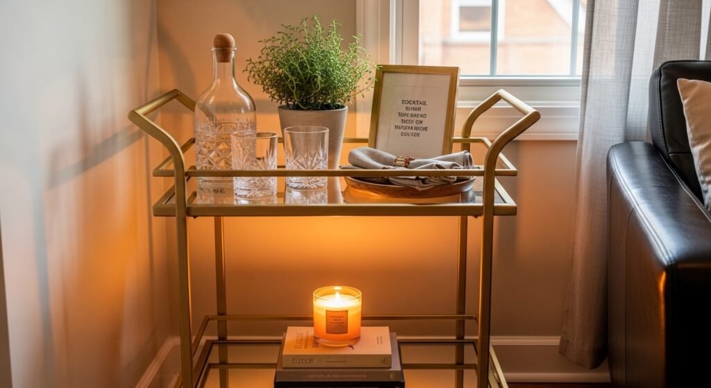 A small bar cart or beverage station adds a touch of sophistication and hospitality to your living room while taking up minimal floor space. Whether you stock it with cocktail essentials, a tea collection, or simply use it as a stylish display surface, it makes your space feel more intentional and welcoming.