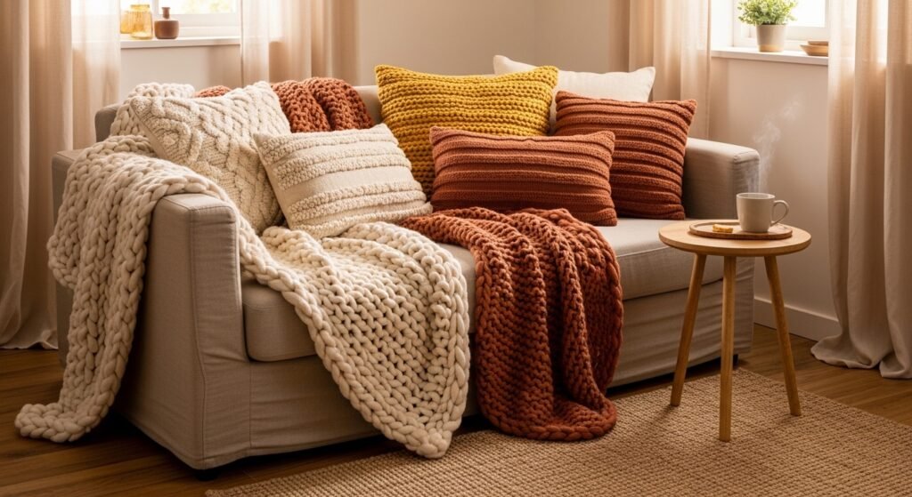 Nothing says cozy quite like an abundance of soft textures. One of the simplest cozy small living room ideas is layering throws and cushions in complementary warm tones across your seating. Think chunky knit blankets, velvet pillows, and faux fur accents that invite you to curl up and stay awhile.