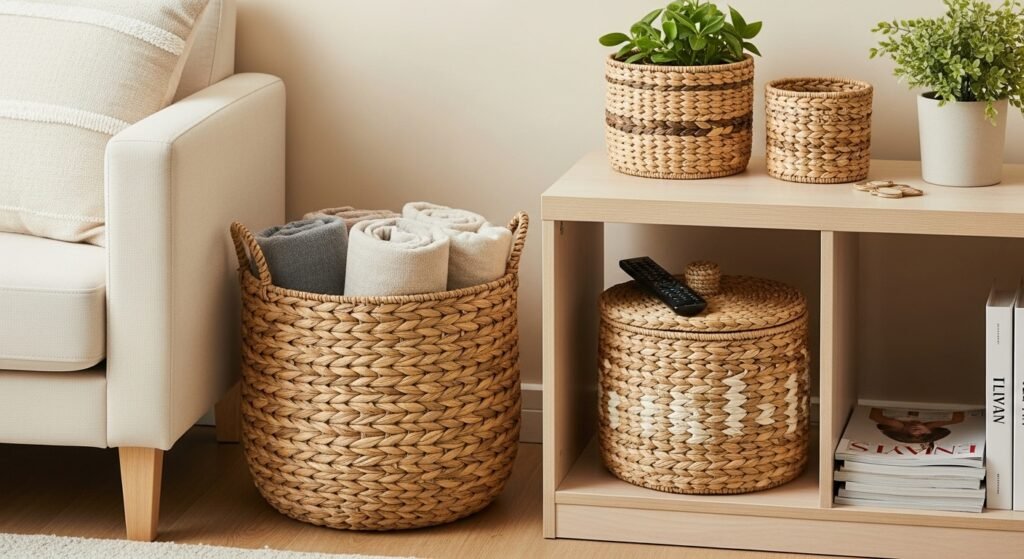 Woven baskets are the unsung heroes of small living room organization. They hide clutter — blankets, toys, remotes, magazines — while adding beautiful natural texture and warmth to your space. Available in countless sizes, shapes, and weave patterns, baskets blend seamlessly into virtually any decor style from bohemian to farmhouse to contemporary.