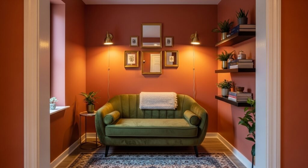 Embrace darker, warmer hues to create an enveloping cocoon-like atmosphere in your small living room. Deep terracotta, warm olive, rich navy, or chocolate brown walls can make a compact room feel incredibly intimate and sophisticated rather than closed-in. This is one of those cozy small living room ideas that feels counterintuitive but works beautifully.