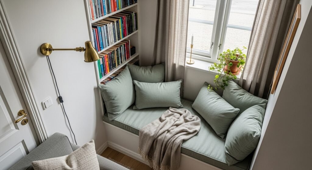 Style your reading nook with a small wall-mounted lamp for task lighting, a lightweight throw for chilly evenings, and a tiny side table or wall shelf to hold your current read and a cup of tea. The trick is making this corner feel like its own little world — a peaceful escape within your living room that beckons you to sit and stay.