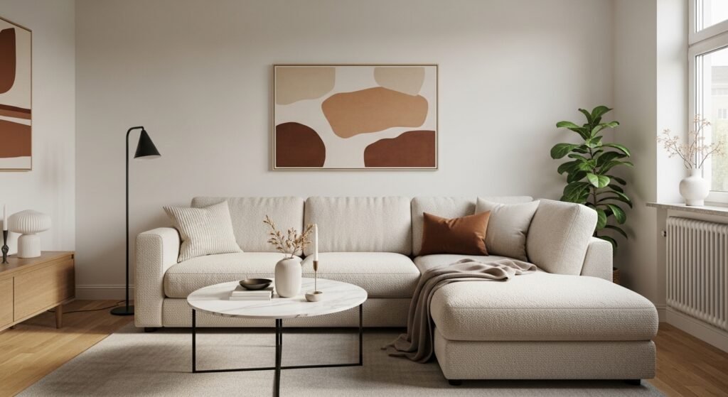 Choose a sectional in a light neutral fabric like boucle or linen to keep the visual weight minimal. Position it against the longest wall or in an L-shape to define the seating area naturally. Among all cozy small living room ideas, this one strikes the perfect balance between comfort and space-consciousness, giving you plenty of room to lounge without sacrificing precious floor space.