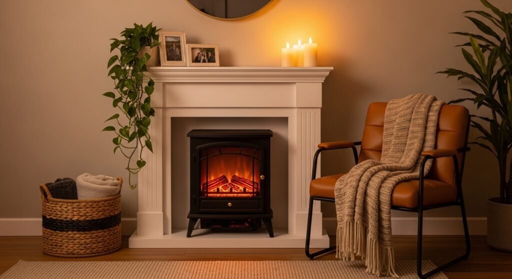 Nothing anchors a living room quite like a fireplace, and even the smallest spaces can accommodate one. Electric fireplace inserts or faux mantels create an instant focal point that radiates warmth — both literally and visually. This is one of the most impactful cozy small living room ideas for renters and homeowners alike.