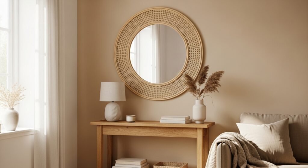 Among popular cozy small living room ideas, mirrors offer dual functionality — they’re both decorative and practical. Choose frames that complement your aesthetic, whether it’s a rustic wooden frame for farmhouse charm, a sleek brass frame for modern elegance, or a natural rattan frame for bohemian warmth. The reflected light creates a sense of spaciousness while maintaining that intimate cozy atmosphere.