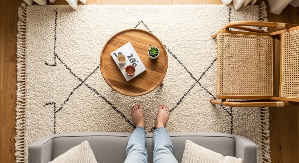 A thick, plush area rug instantly transforms a hard floor into a warm, inviting surface that makes your entire living room feel cozier. Choose a rug that’s large enough to anchor your seating arrangement — ideally, all front legs of your furniture should sit on the rug to create a unified, intentional look.