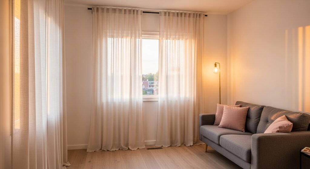 Choose lightweight fabrics like linen or sheer cotton in warm neutral tones that allow natural light to filter through gently. The flowing fabric adds movement and texture to your walls, creating that dreamy, enveloping feeling every cozy room needs. For extra warmth during winter, layer sheer curtains with heavier drapes that you can draw closed on chilly evenings.