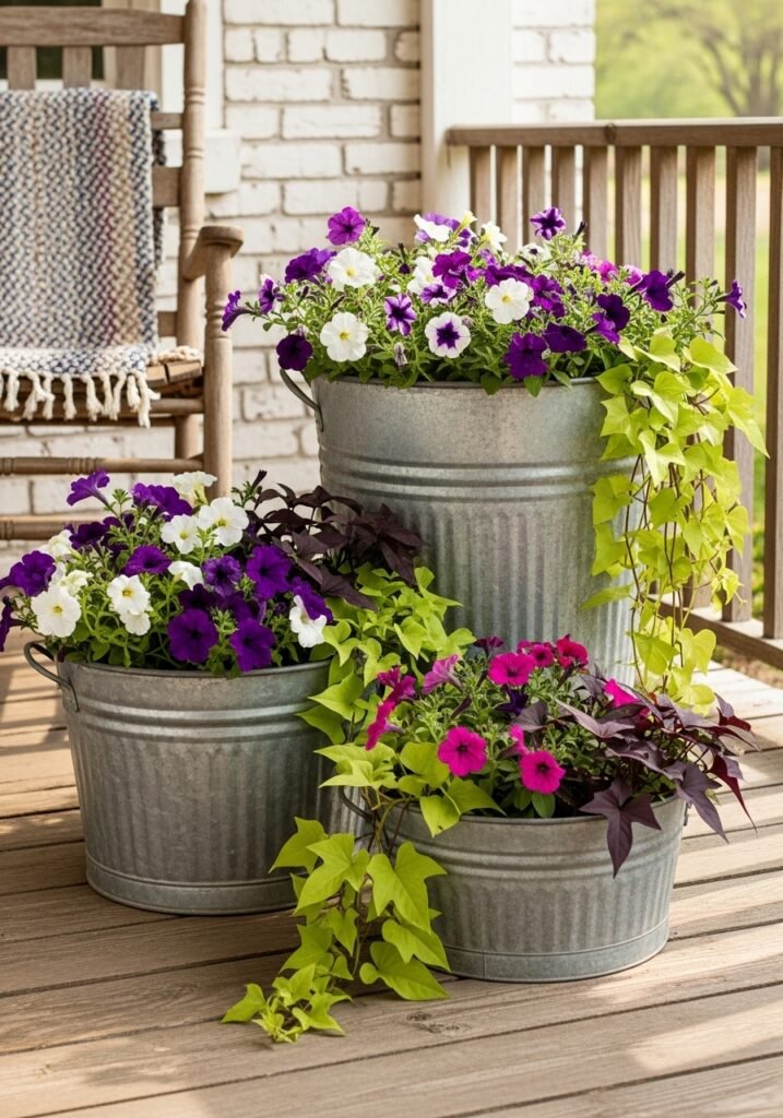 Old galvanized washtubs and buckets make incredible oversized planters for rustic gardens. Their silvery patina catches the light beautifully while providing ample room for flowers, herbs, or small shrubs. Group several sizes together near your porch for a collected, farmhouse-chic garden display.