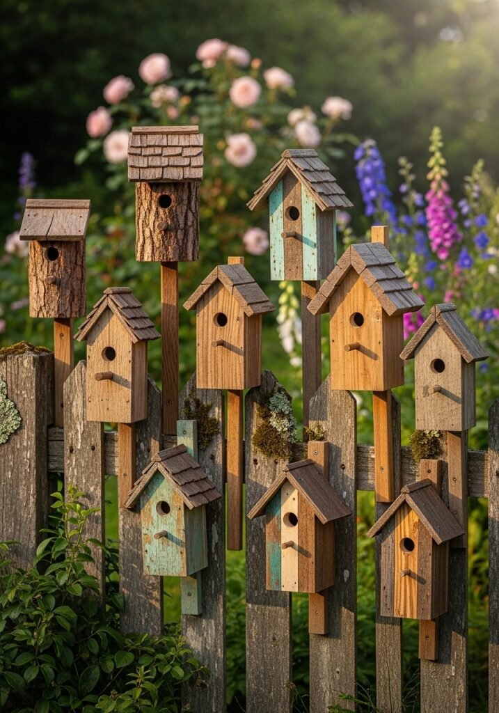 Create a whimsical birdhouse village by mounting multiple rustic birdhouses on a fence, tree, or standalone post. Each birdhouse can feature different weathered wood finishes, colors, and designs for an eclectic, charming collection. This delightful garden decor idea attracts real birds while adding visual enchantment to your space.