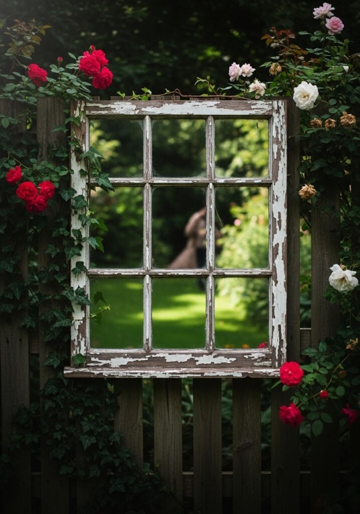 Repurpose an old window frame by adding a mirror behind the panes to create a stunning garden focal point. Hang it on a fence, shed wall, or garden structure to reflect light and greenery. This clever rustic garden decor trick makes small spaces appear larger and more luminous.