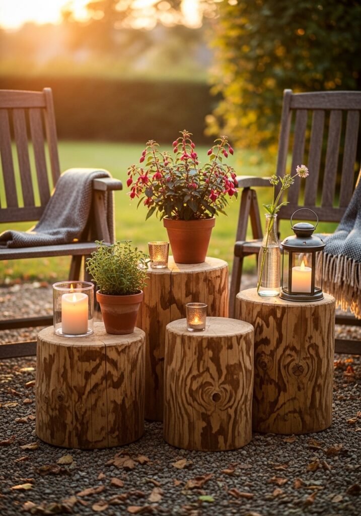 Transform fallen tree stumps into charming outdoor side tables that serve as functional rustic garden decor. Simply sand the top surface smooth, apply a weather-resistant sealant, and place them beside garden seating areas. Each stump’s unique rings and natural shape make it a one-of-a-kind piece of living art.