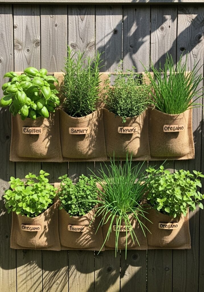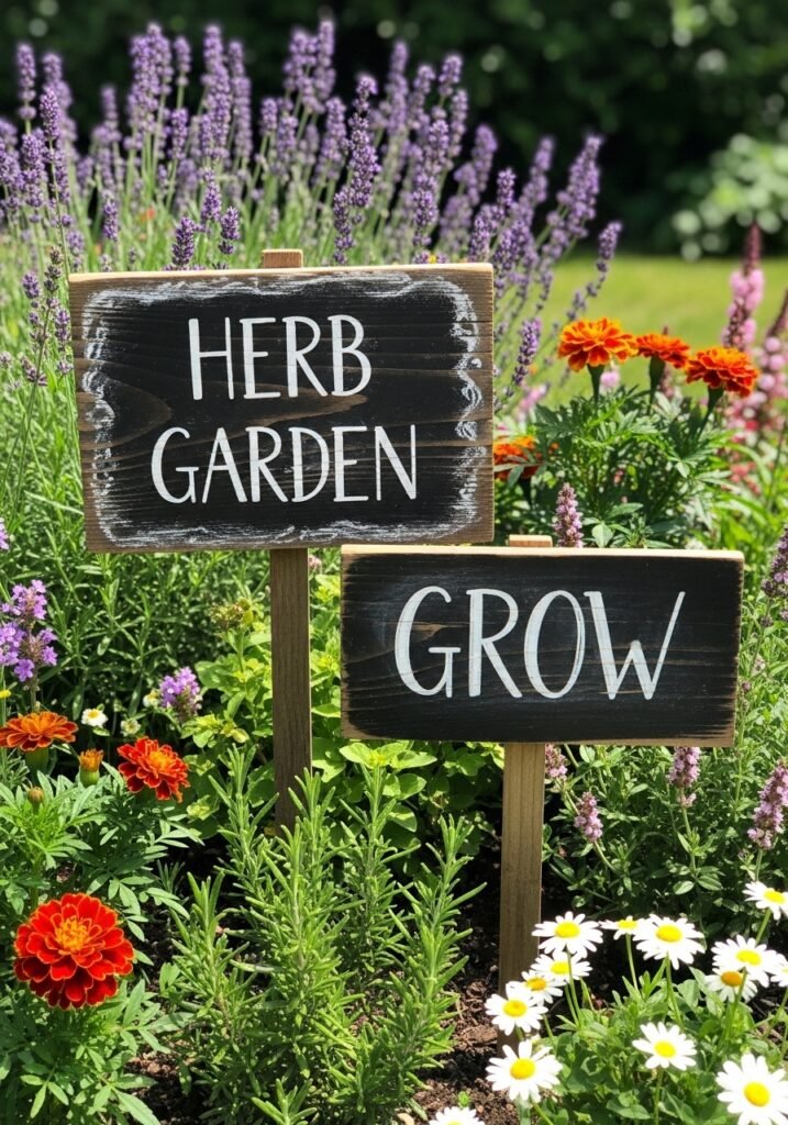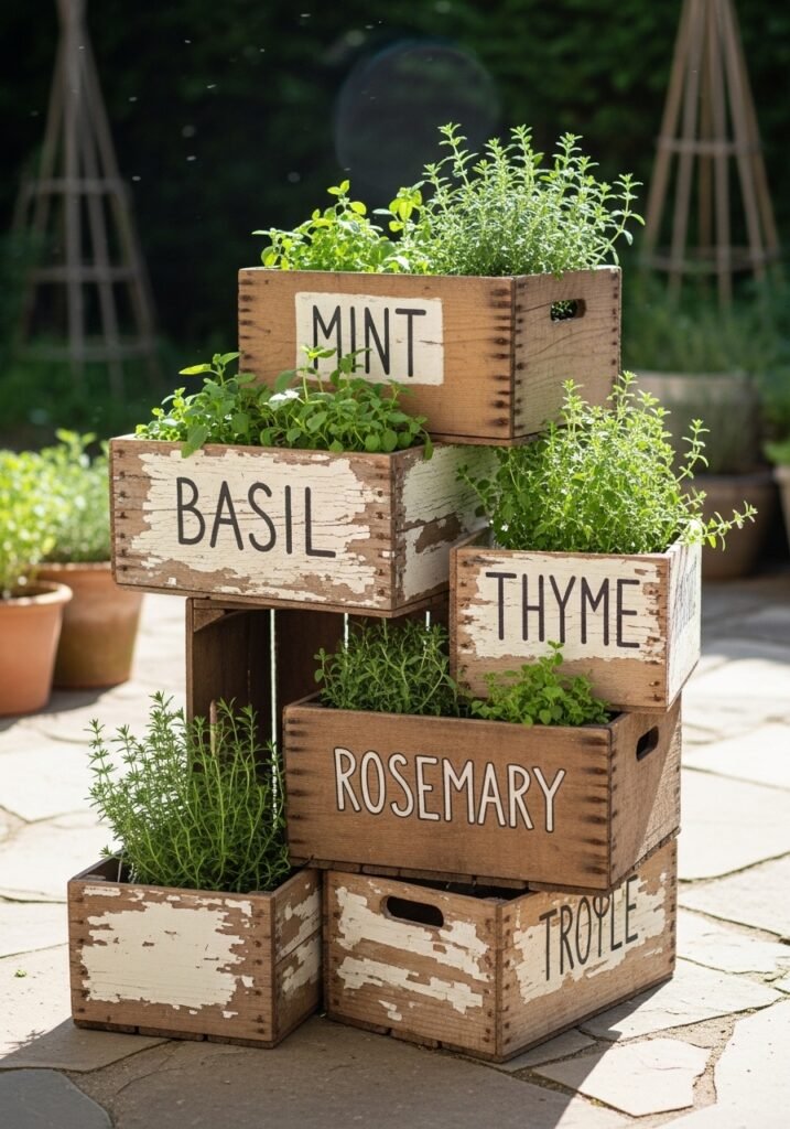 Stack vintage wooden crates to create an organized, beautiful herb garden that doubles as rustic garden decor. Label each section with hand-painted signs for basil, rosemary, thyme, and mint. The aged wood and hand-lettered markers create a farmhouse aesthetic that’s both practical and gorgeous.