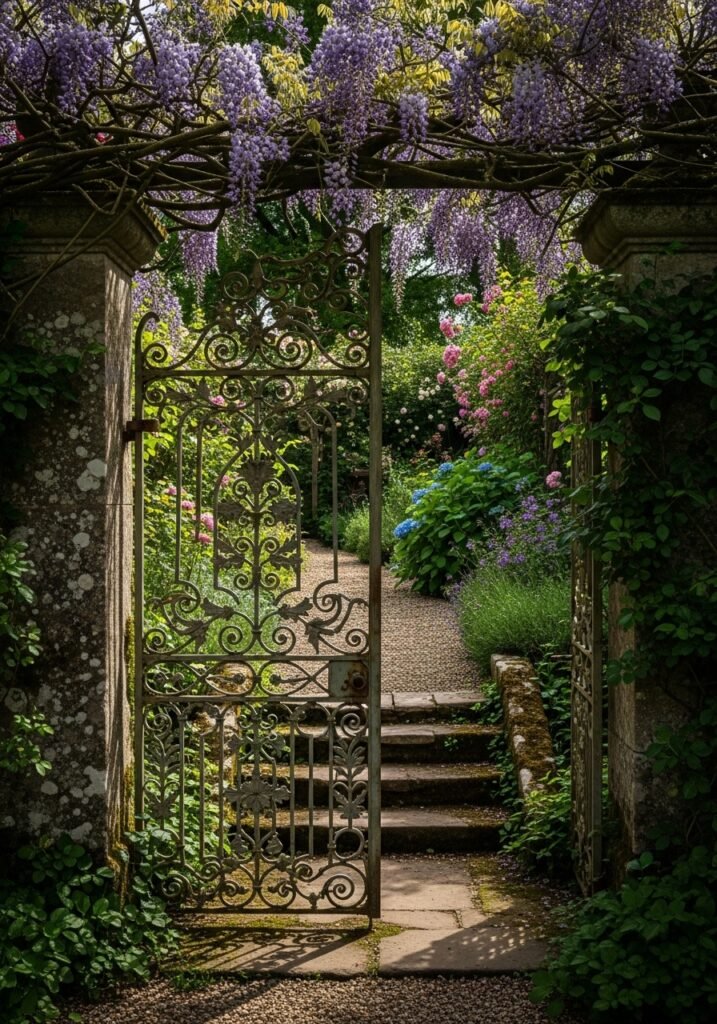 Let climbing roses, wisteria, or jasmine weave through the iron scrollwork for a romantic, overgrown look. The combination of hard metal and soft blooms is quintessential rustic garden decor at its finest. This is the kind of garden inspiration that makes visitors feel like they’re stepping into a secret, enchanted world.