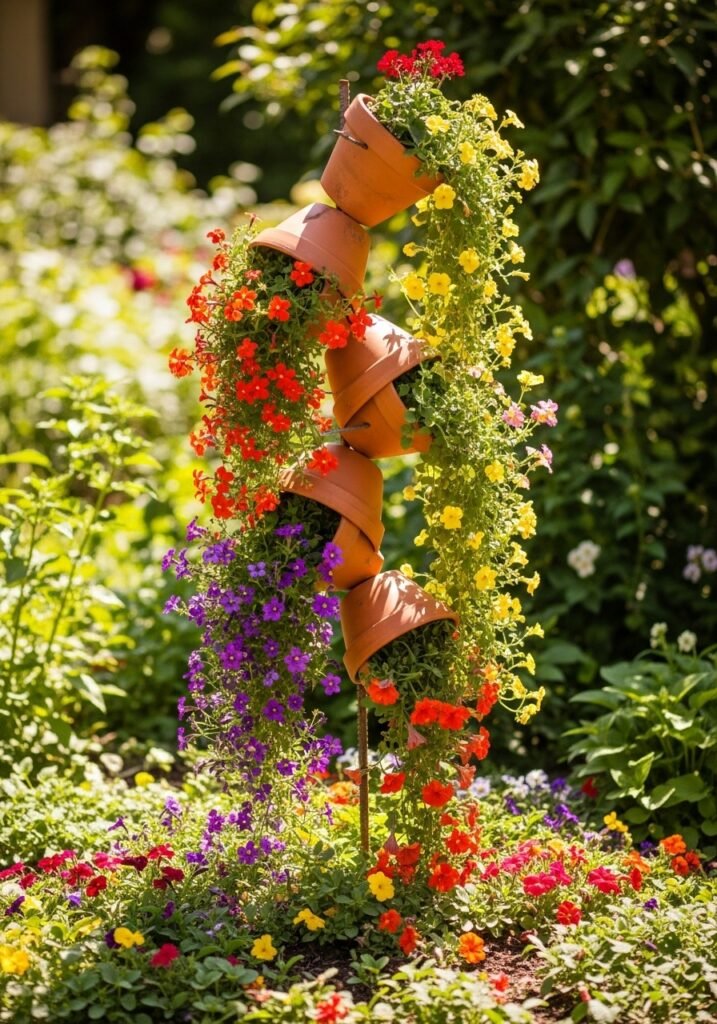 Stack terracotta pots of descending sizes on a rebar stake to create a whimsical tower of cascading flowers. Tilt each pot slightly to spill blooms in different directions for a playful, dynamic display. This charming garden decor idea adds vertical interest and a touch of Italian countryside romance.