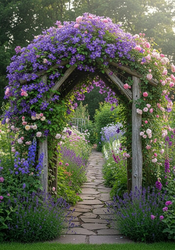 Build or install a wooden arbor using rough-hewn timber or reclaimed wood for a stunning garden entrance feature. Train climbing plants like clematis, morning glory, or grapevines to cover it over time. A rustic arbor frames your garden beautifully and creates a natural doorway between outdoor spaces.