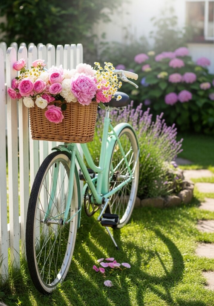 An old bicycle with a basket overflowing with flowers is one of the most photographed rustic garden decor ideas on Pinterest. Lean it against a fence, wall, or tree and fill the basket with vibrant seasonal blooms. Add a few trailing plants for movement and a whimsical, carefree garden vibe.