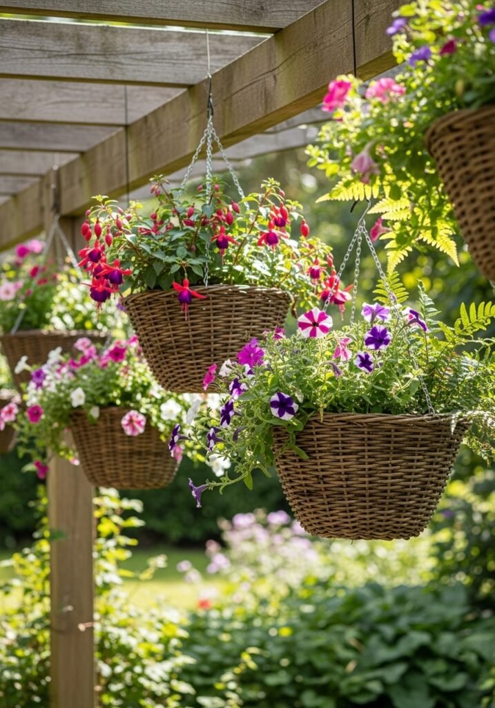Group multiple hanging baskets at varying heights from a pergola, porch, or tree branches for a lush overhead garden display. Use woven wicker, wire, or coconut coir baskets for maximum rustic garden appeal. Fill them with cascading ferns, petunias, fuchsias, or trailing succulents for year-round color.