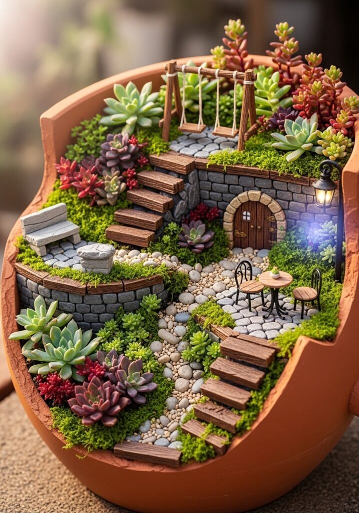 This creative project turns garden accidents into artistic opportunities that delight children and adults alike. Place your fairy garden on a patio table, tree stump, or garden shelf where it can be admired closely. It’s one of those imaginative garden decor projects that sparks conversation and brings a touch of whimsy to your rustic gardens.