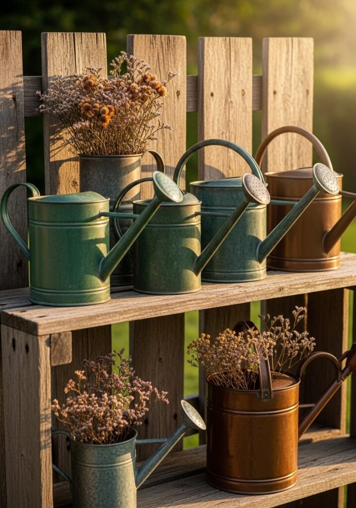 Display vintage copper watering cans on shelves, fence posts, or along garden steps for gorgeous rustic garden decor. The warm copper tones develop a beautiful green patina over time that looks absolutely stunning against garden greenery. Group them in odd numbers for the most visually pleasing arrangement.