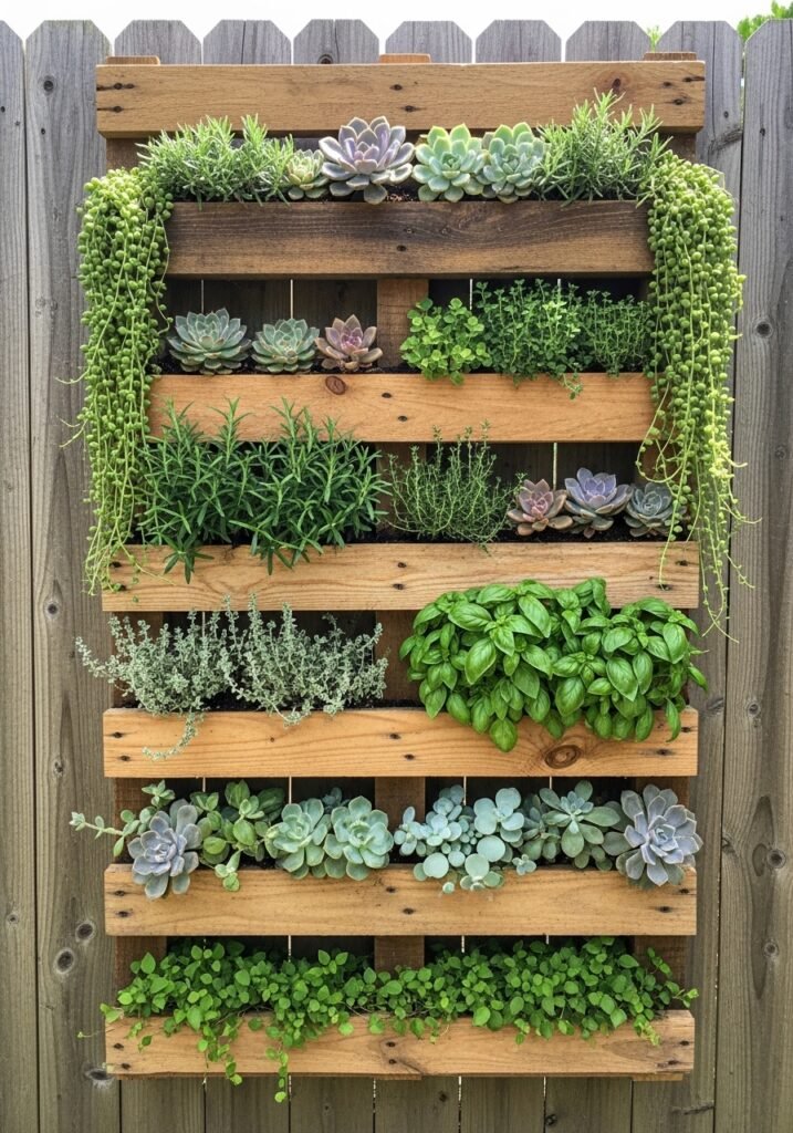 Upcycle a shipping pallet into a vertical garden planter by adding landscape fabric and filling sections with soil. Mount it on a fence or wall to create a living wall of herbs, succulents, or cascading flowers. This space-saving garden decor project is perfect for urban dwellers with limited ground space.