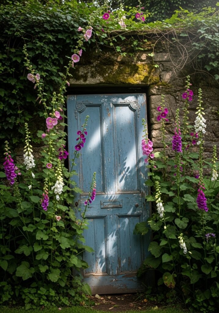 Frame the door with tall plantings like hollyhocks, foxgloves, or ornamental grasses to suggest a secret doorway to another world. This imaginative garden decoration idea adds height, mystery, and old-world romance to any outdoor space. It’s the kind of garden inspiration that transforms ordinary backyards into storytelling environments full of character and wonder.