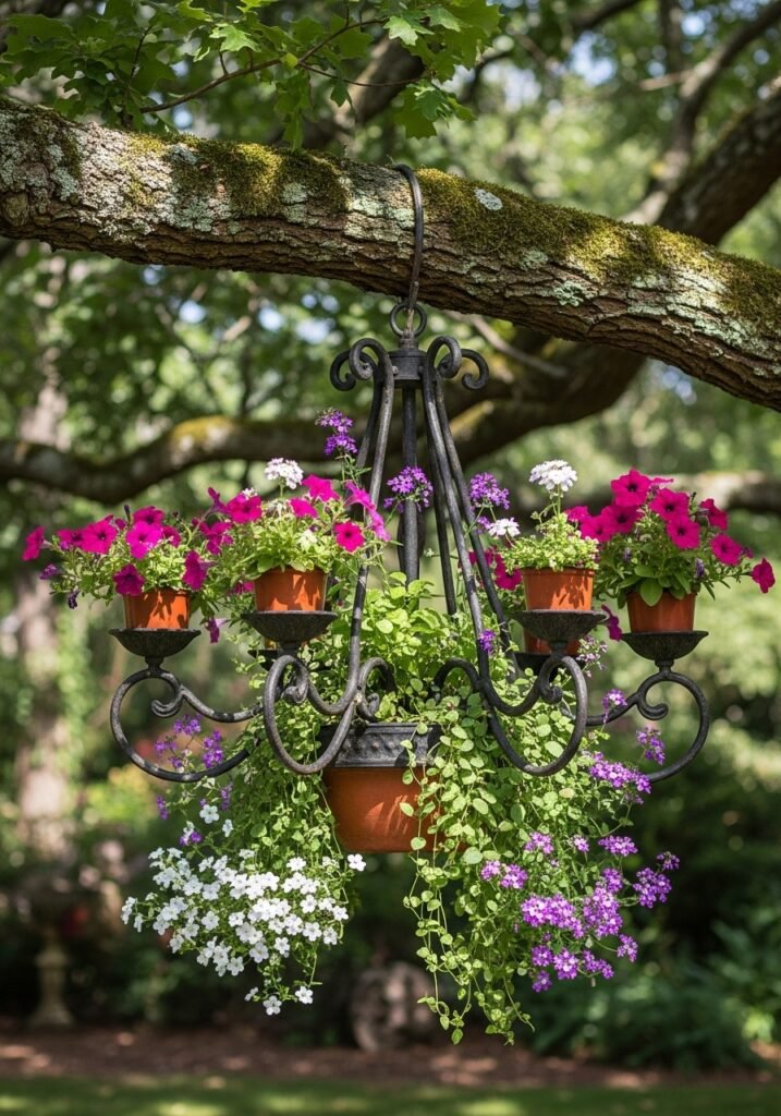 Repurpose an old iron or crystal chandelier as an unexpected hanging planter for your garden. Remove the wiring, add small pots to each arm, and plant cascading flowers for a truly unforgettable display. This creative rustic garden decor piece blends elegance with countryside charm in the most unexpected way.