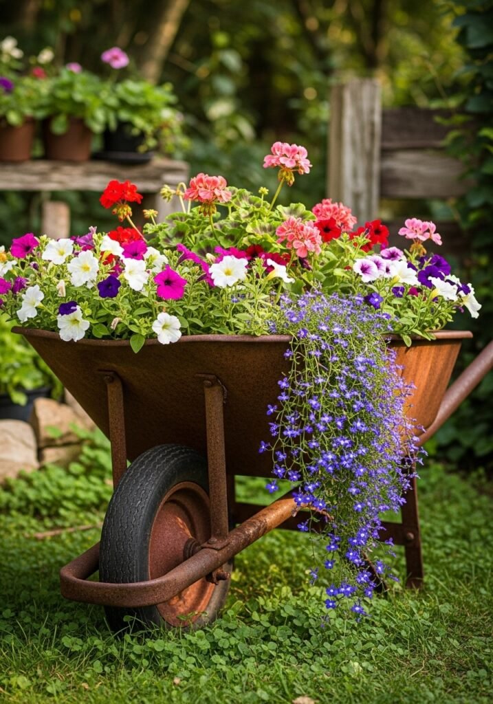 Position your wheelbarrow near a garden path or beside the front door for maximum curb appeal. This is one of those garden decor ideas that looks incredibly expensive and professionally designed, yet costs almost nothing. It’s pure garden inspiration that works in any size outdoor space beautifully.