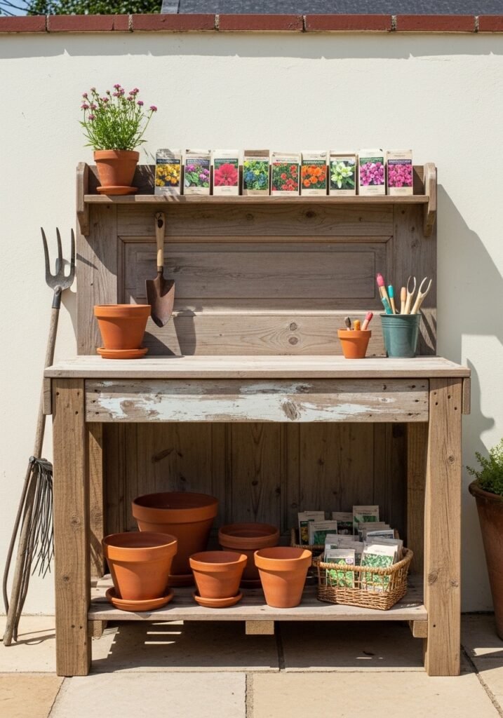 Position it against a sunny wall near your garden beds for convenient access during planting season. A weathered potting bench photographed with terracotta pots and garden gloves is pure Pinterest magic. This is one of those garden ideas that serves double duty—practical workspace by day, stunning garden aesthetic backdrop for photos anytime.