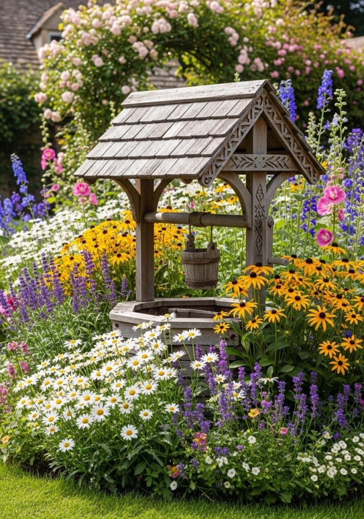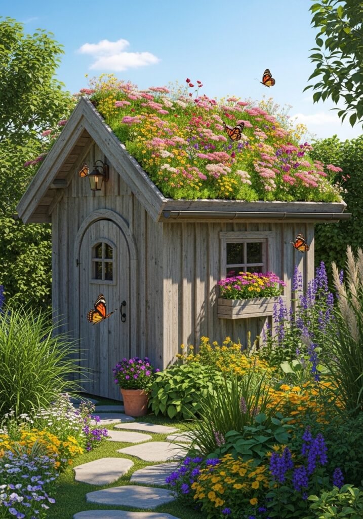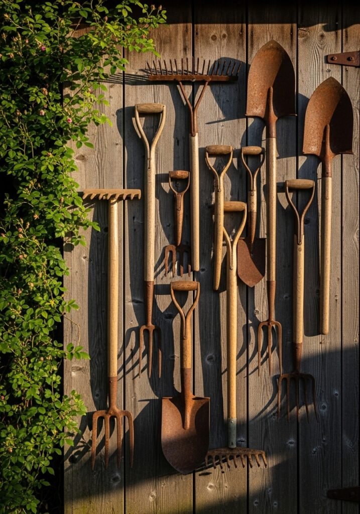 Hang antique garden tools on the exterior walls and place clay pots near the entrance. Your rustic garden shed can double as a potting station, art studio, or quiet reading nook. This is one of the most impactful garden decor projects that adds both function and fairy-tale charm to your entire backyard.