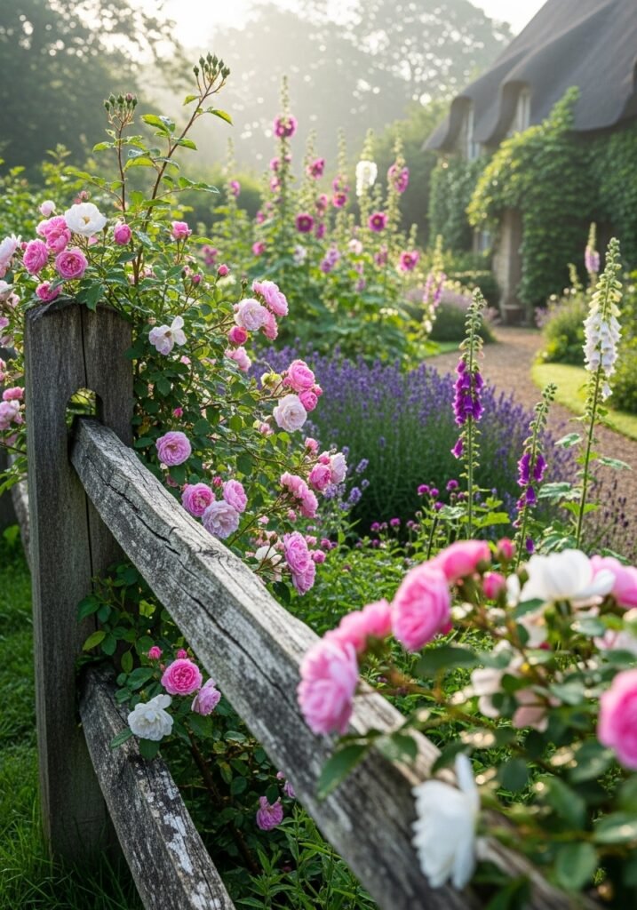 A rustic garden fence draped with climbing roses creates a fairy-tale scene straight from an English countryside cottage. Choose a weathered split-rail or picket fence made from natural, untreated wood. The imperfections in the wood grain add texture and depth that polished fences simply cannot replicate.