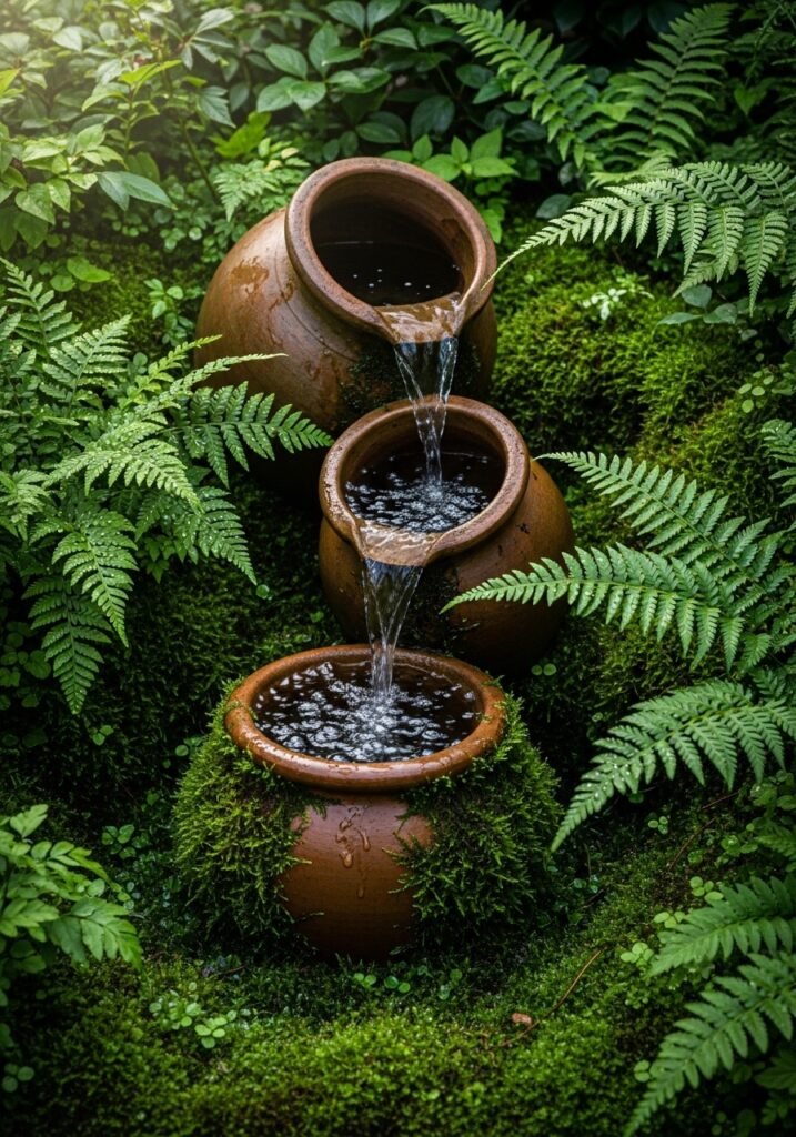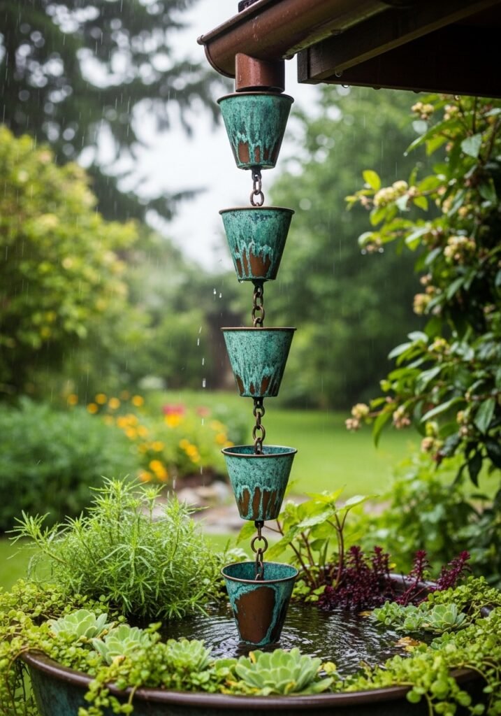 Replace a standard downspout with a decorative copper or iron rain chain that guides rainwater in a beautiful visible cascade. The chains, cups, or links create musical sounds as water flows down during rainstorms. This functional garden decor element turns ordinary rainfall into a mesmerizing garden performance.