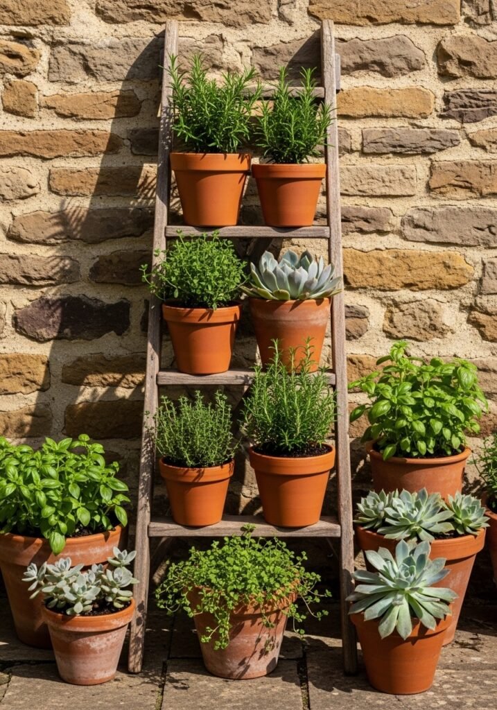 Sand the ladder lightly to remove splinters but keep the natural aged finish intact. This DIY-friendly project is perfect for small patios and balconies where floor space is limited. It’s one of those garden ideas that combines functionality with beauty, giving you an eye-catching display without spending a fortune on store-bought shelving.