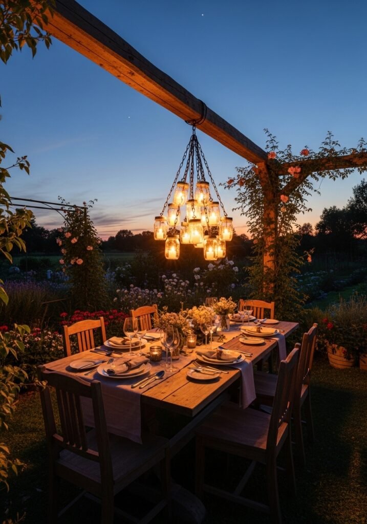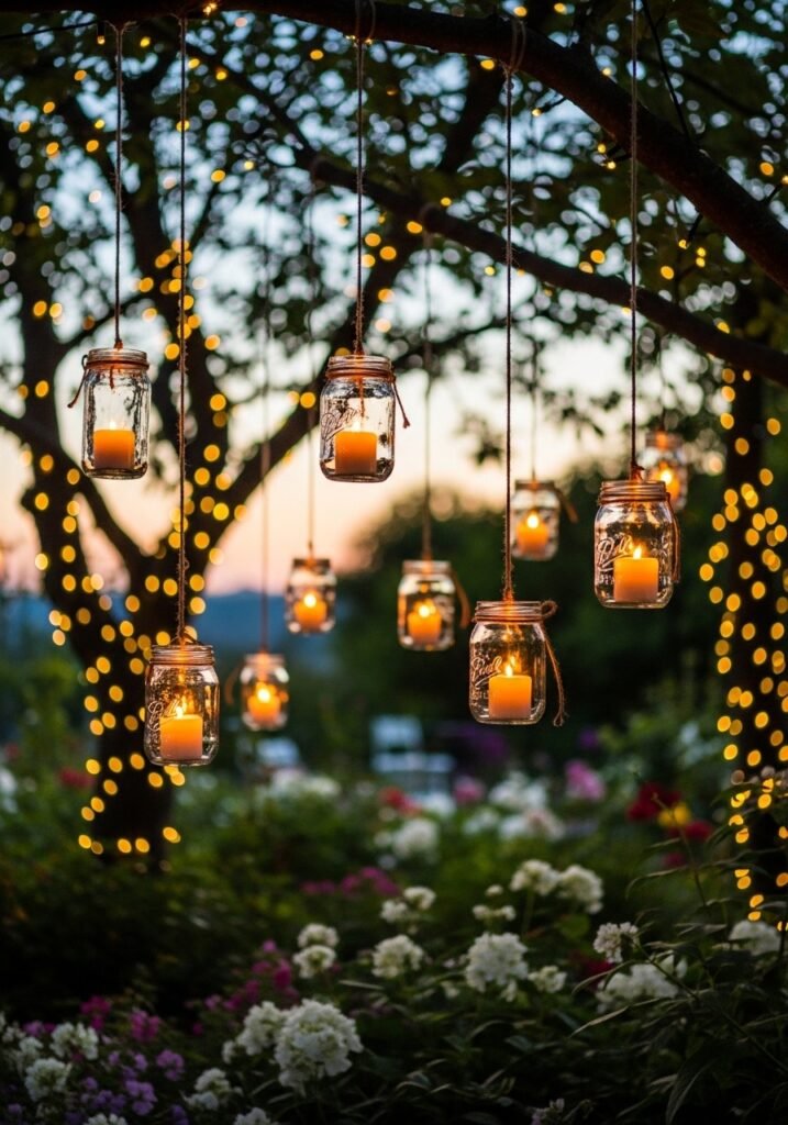 Hang mason jars filled with candles or fairy lights from tree branches to create magical evening ambiance. These twinkling lights transform any backyard into an enchanting rustic garden paradise after sunset. Use wire or twine to suspend the jars at varying heights for a cascading, starlight effect.