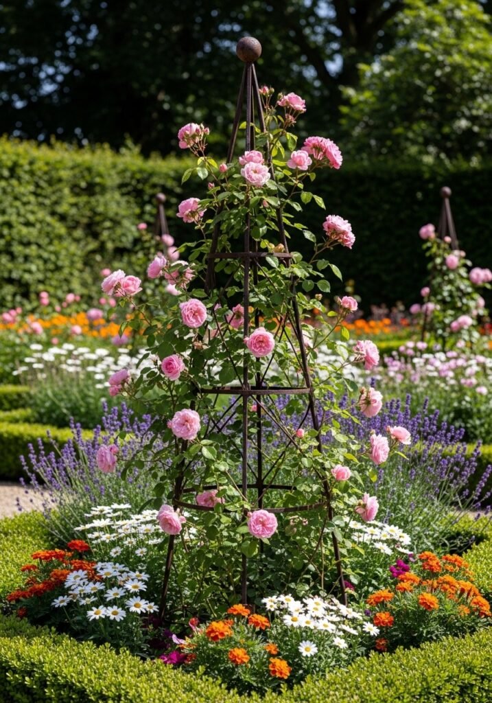 Stack them with small terracotta pots nearby for a vignette that’s pure garden aesthetic perfection. You can also use decorative cloches to showcase special garden specimens or create focal points in flower beds. These simple wire structures are among the most iconic garden decoration ideas that blend function with farmhouse beauty seamlessly.