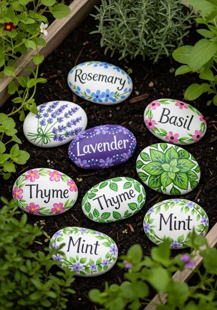 Paint smooth river rocks with plant names, inspirational words, or decorative designs to scatter throughout garden beds. These colorful, hand-painted stones add personality and whimsy to your rustic garden decor while serving as helpful plant identification markers. Each painted rock becomes a small treasure to discover.