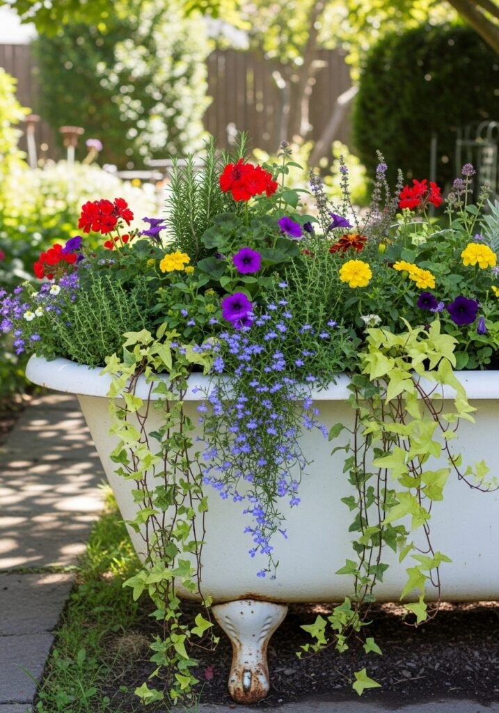 Position the bathtub in a prominent garden spot and let trailing plants spill dramatically over the sides. The porcelain and iron develop beautiful aged character when exposed to the elements over time. This is one of those bold garden ideas that proves the best garden decor projects come from seeing potential beauty in discarded objects.