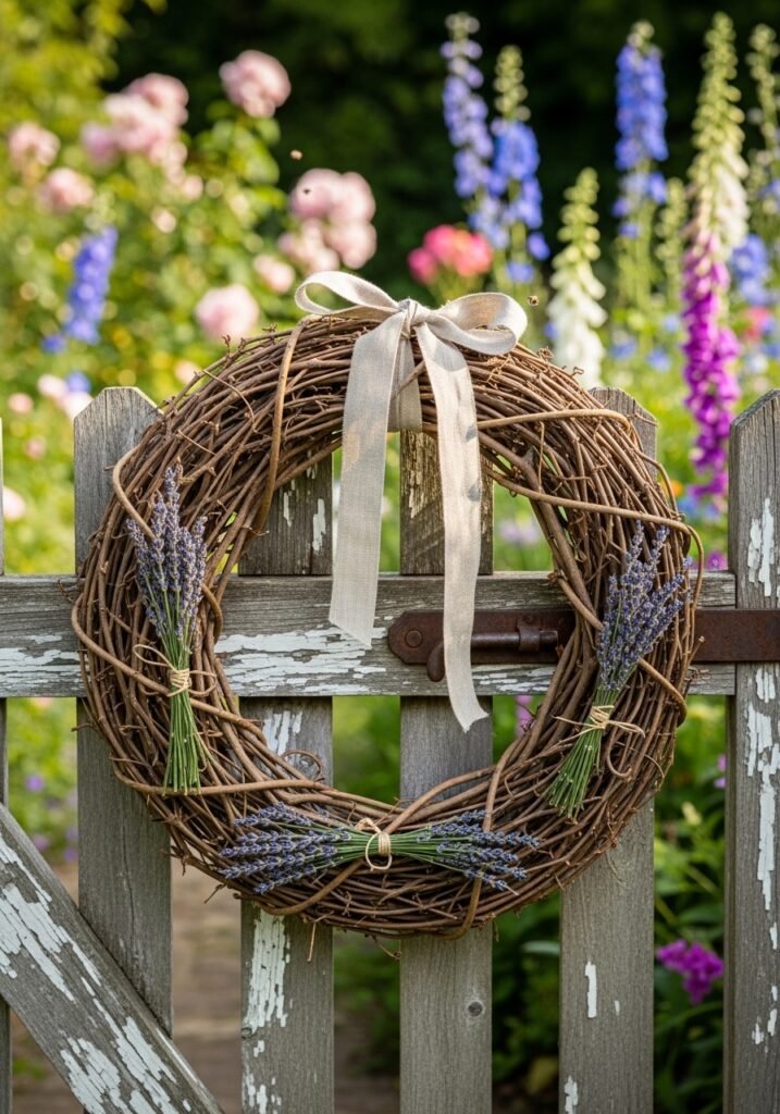 Hang grapevine wreaths decorated with dried flowers, ribbon, and small garden elements on fences, gates, and shed doors. These circular natural accents add warmth and seasonal charm to every vertical surface in your rustic gardens. Change the decorations seasonally to keep your garden feeling fresh and festive year-round.