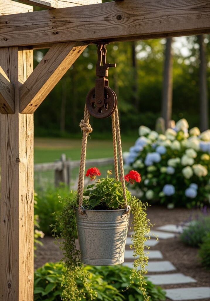 Pair pulleys with rope, galvanized buckets, and aged wood for a cohesive industrial-rustic aesthetic. These hard-working antiques bridge the gap between decorative and functional in the most appealing way. Vintage pulleys are one of those rustic garden decor treasures that bring authentic agricultural heritage into your modern garden design beautifully.