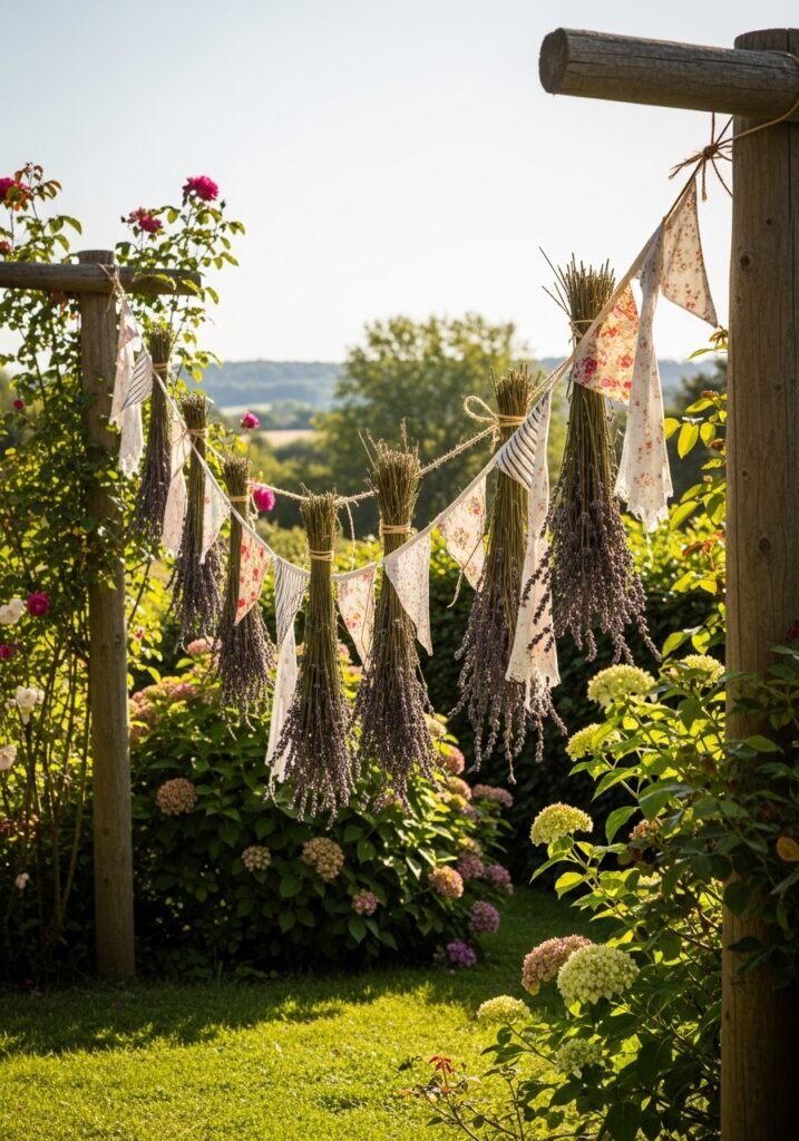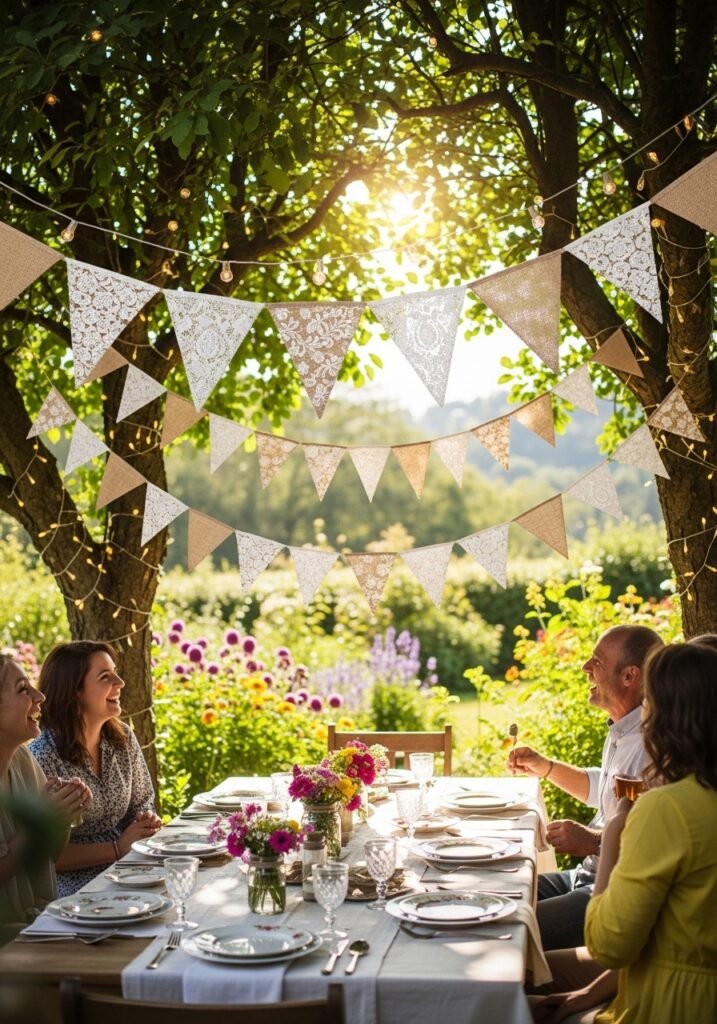 String burlap, fabric, or lace bunting across garden areas to add festive, celebratory charm to outdoor spaces. Choose neutral, earthy tones for everyday display or colorful patterns for special garden parties and celebrations. This easy garden decor addition transforms ordinary spaces into inviting, festive environments instantly.