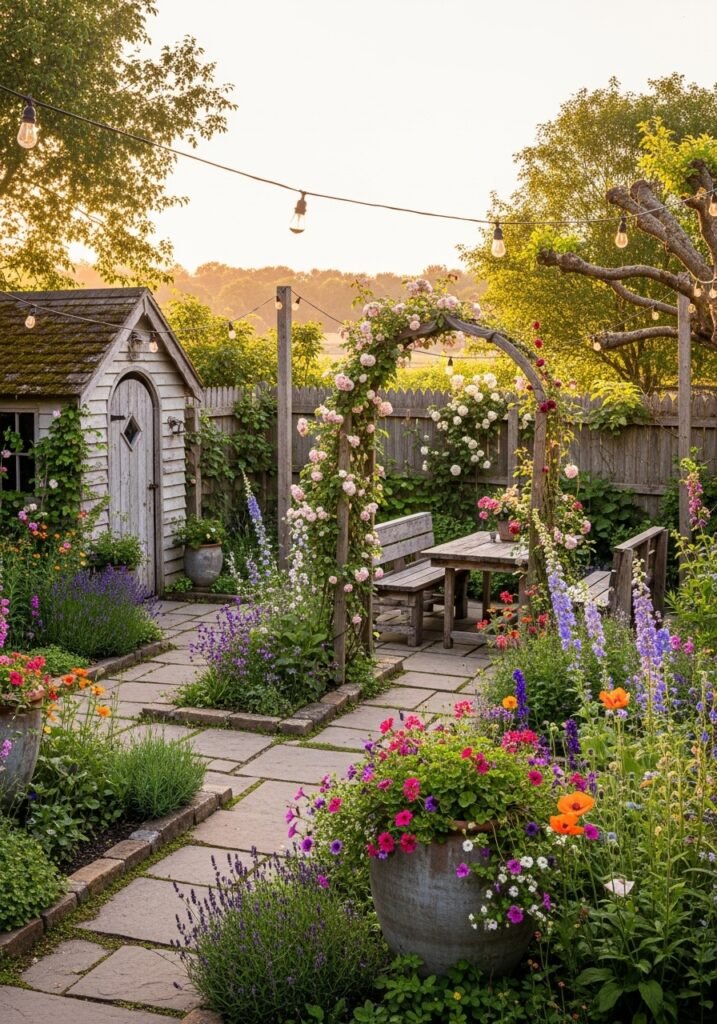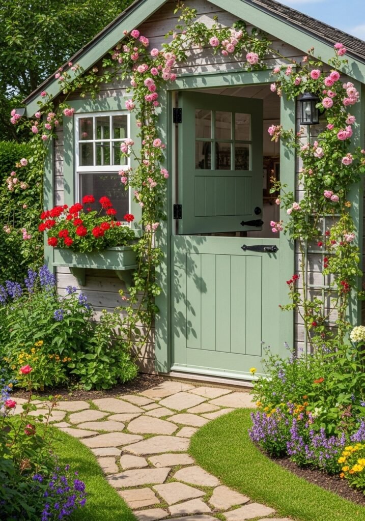 A Dutch door framed by climbing roses or window boxes creates the most photographed feature of any garden. This single architectural detail transforms an ordinary storage shed into a storybook garden destination. It’s one of those garden decor ideas that delivers outsized visual impact and makes your entire rustic garden feel more charming.