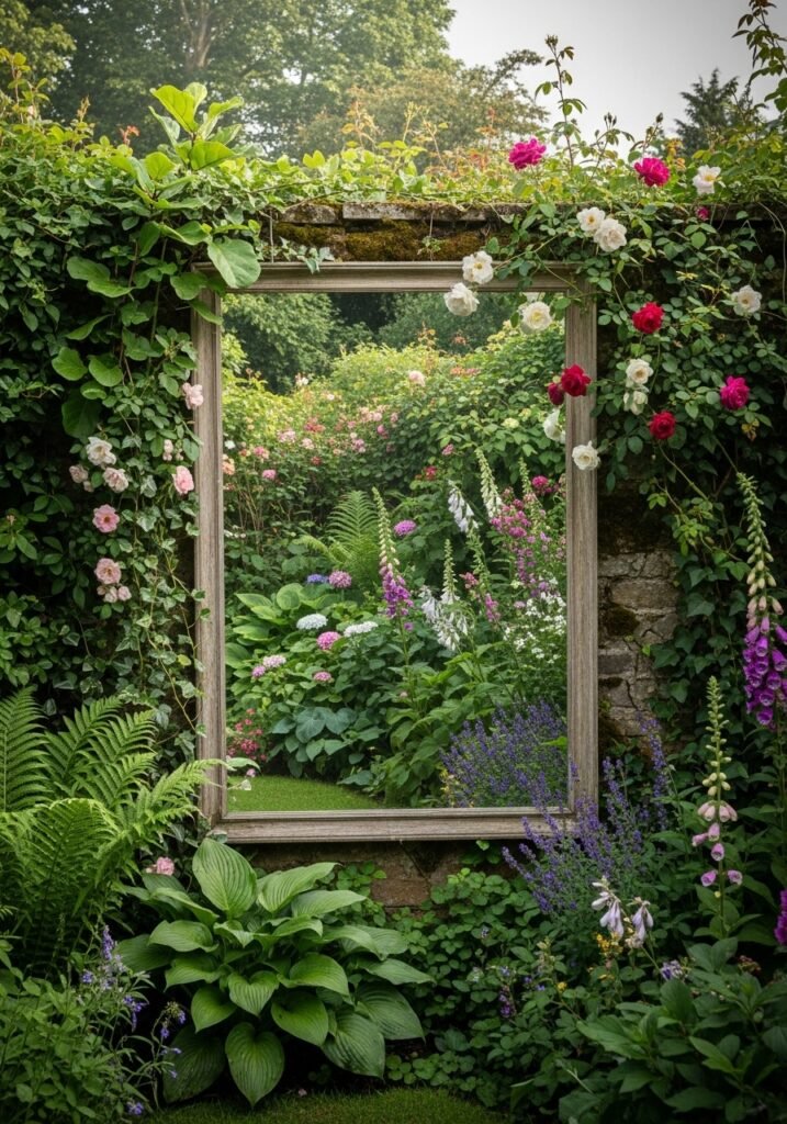 Position the mirror to reflect the most beautiful view in your garden for maximum impact and visual delight. Frame it with climbing plants so it appears to be a window into another garden entirely. This is one of those brilliant garden decoration ideas that landscape designers use to create mystery, depth, and magic in rustic gardens.