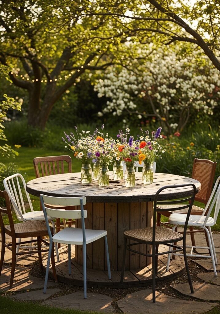 Add mismatched chairs, stools, or hay bales around the spool table for eclectic, casual outdoor dining. Centerpiece it with a mason jar flower arrangement and candles for a complete rustic tablescape. This is one of those satisfying garden ideas that gives discarded industrial materials a beautiful second life in your outdoor entertaining space.