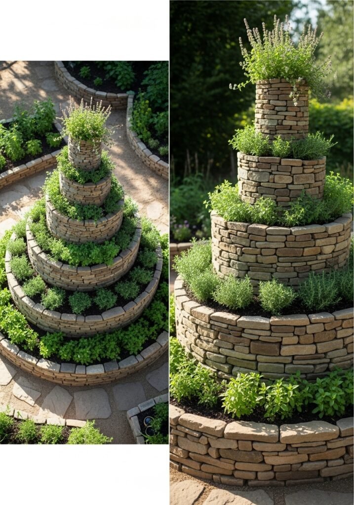 Build a spiral-shaped raised bed using stacked stones or bricks that winds upward like a snail shell. Plant different herbs at each level, taking advantage of varying sun exposure and drainage conditions throughout the spiral. This architectural garden decor feature is both visually stunning and incredibly functional for herb growing.