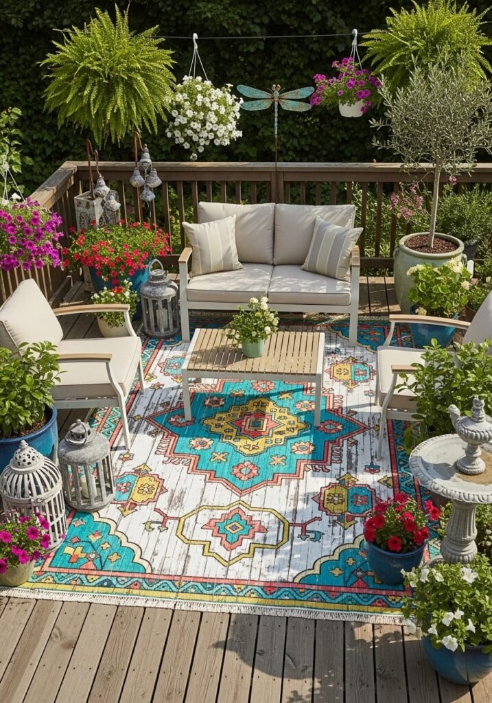 Paint a faux rug design directly on your wooden deck or patio for a creative, permanent rustic garden decor feature. Use stencils to create geometric, floral, or medallion patterns in weather-resistant exterior paint. This unexpected design element adds color, pattern, and personality to plain wooden surfaces.