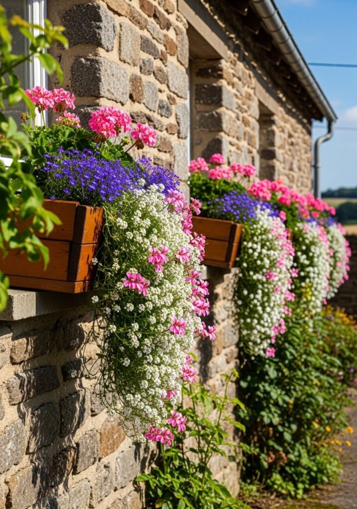 Install wooden window boxes on your home, shed, and fence to create a continuous ribbon of flowers and greenery throughout your property. Use reclaimed wood and simple brackets for an authentic rustic garden aesthetic. Plant trailing flowers like ivy geraniums, lobelia, and sweet alyssum for cascading color.